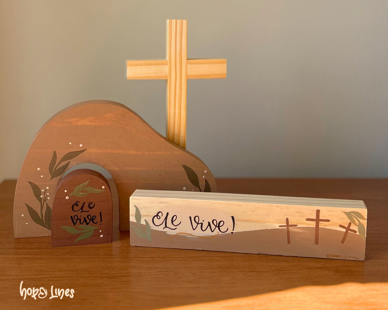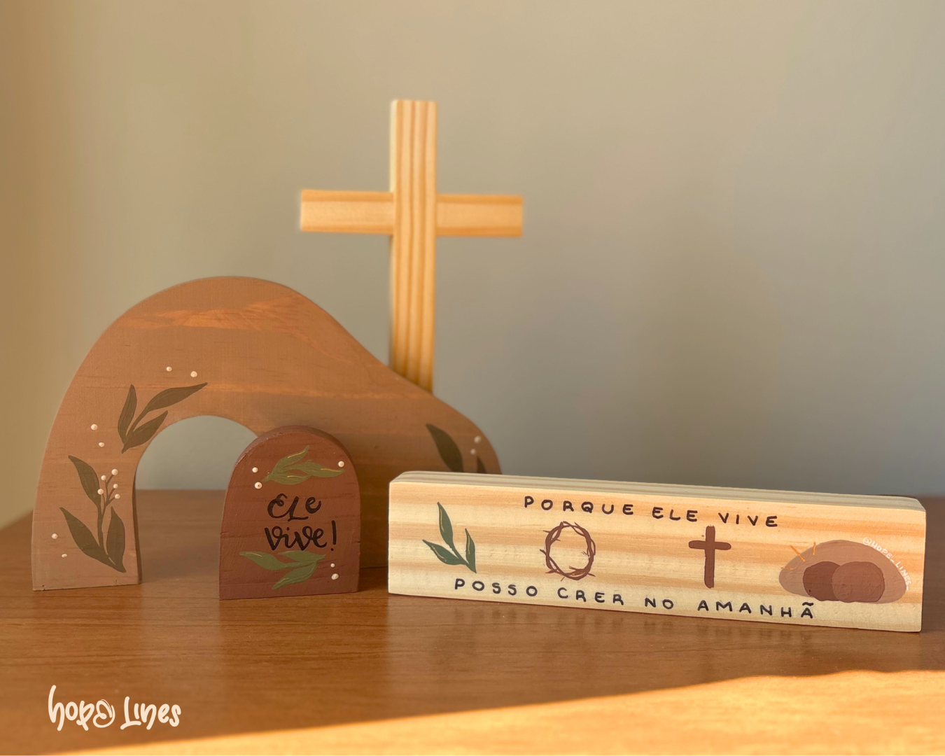 Feito à mão em madeira pinus, o Enfeite Túmulo Vazio é uma peça decorativa especial para a Páscoa, celebrando a ressurreição de Cristo. Com formato de sepulcro, inclui uma cruz colada atrás e uma pedra destacável na frente. Perfeito para decorar sua casa ou presentear, lembrando o verdadeiro significado da Páscoa.